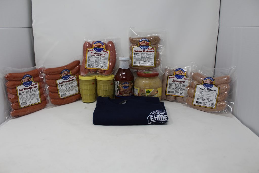 1 package of Bratwurst 1 package of Cheddar Bratwurst 1 package of Chicken Bratwurst 1 package of Krainerwurst 2 packages of All Beef Frankfurters 1 jar of Karl Ehmer BBQ Sauce, 2 Jars Landsberg Spicy German Mustard 1 Kuhne Barrel Sauerkraut 1 XL Karl Ehmer Tshirt *SAVINGS* 5% off when you buy this package!!